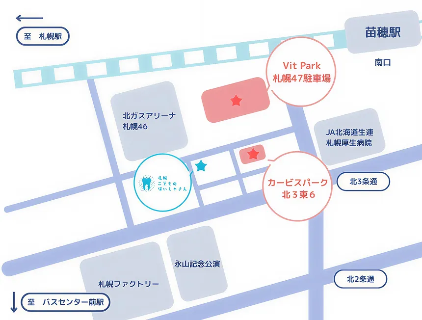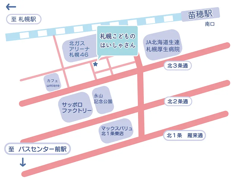 電車でお越しの場合地下鉄地下鉄東西線「バスセンター前」駅 JRJR苗穂駅より徒歩12分 |