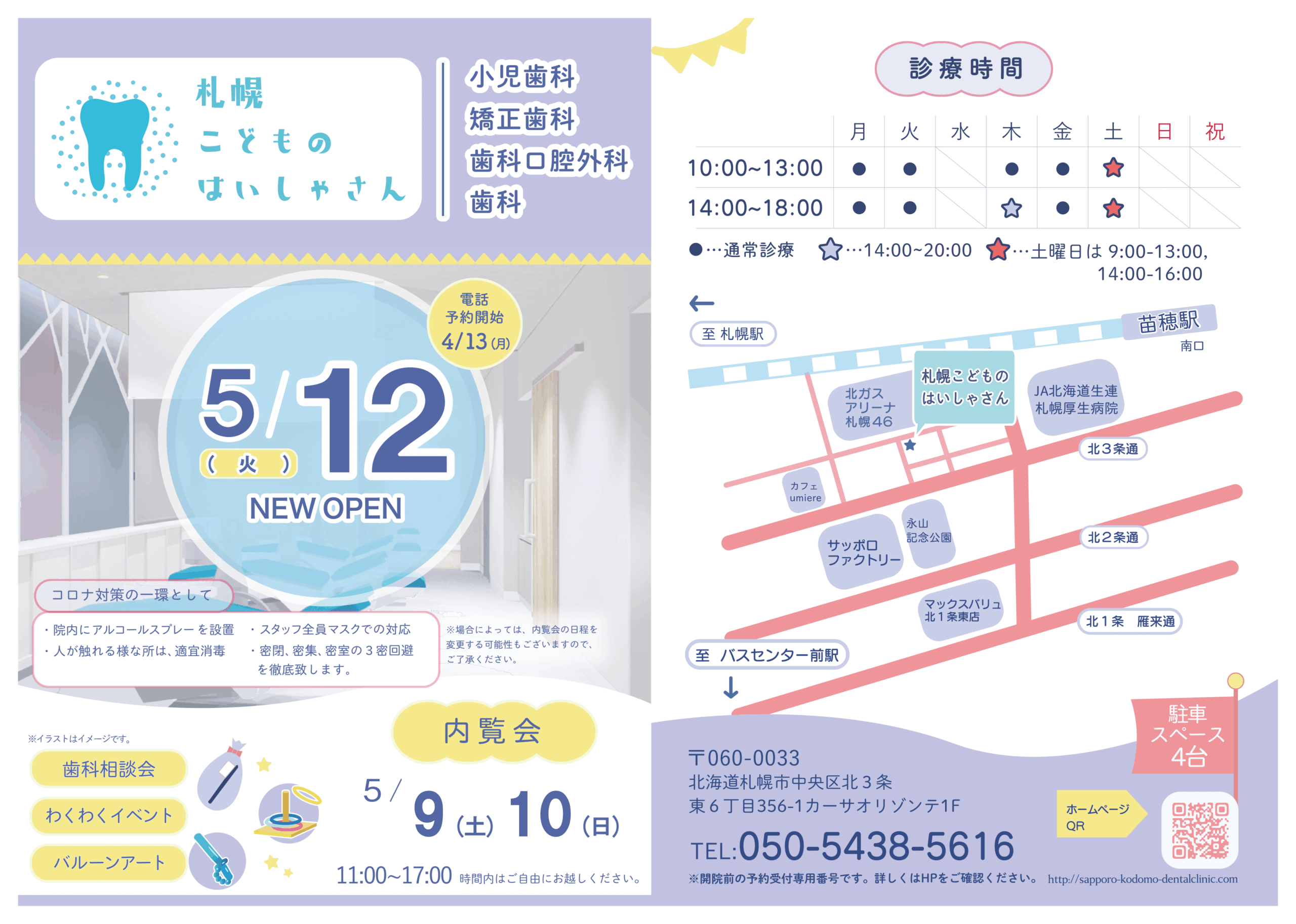news 2020.03.28 新規開業「札幌こどものはいしゃさん」5/12OPEN! 札幌こどものはいしゃさんは、札幌市中央区にある小児歯科専門のクリニックです。妊娠中のお母様の口腔ケアや、0歳の赤ちゃんの口腔ケアも対応いたします。 小児歯科専門医である女性の歯科医師がこどもの発達や成長に合わせてお口の健康をお手伝いいたします。お子様の目線と、お父様・お母様の目線のどちらも大切にし、我が子に行いたい治療をすべてのお子様へ提供できるように、安心できる医院の環境作りに尽力いたします。 札幌こどものはいしゃさん facebook Line twitter